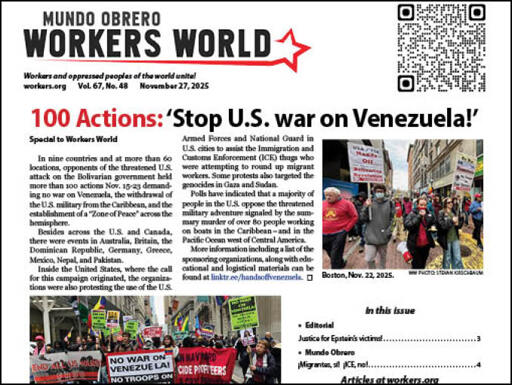 Download the PDF 100 Actions: ‘Stop U.S. war on Venezuela!’ Editorial: Justice for Epstein’s victims! Mundo Obrero: ¡Migrantes, sí! ¡ICE, no! (editorial) B&W version PDF More PDF back-issues here.