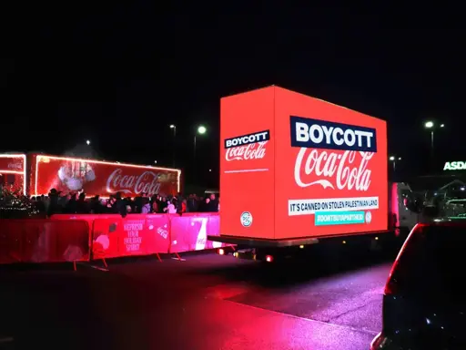 “Holidays are coming”, in association with Coca-Cola. But this year an awkward truth is chasing them all the way. Palestine Solidarity Campaign (PSC) is currently tailing the annual Coca Cola Christmas truck tour across the UK, in a bid to persuade shoppers to boycott Coca-Cola this festive season. An ad-van branded as part of PSC’s Don’t Buy Apartheid campaign is joining […]