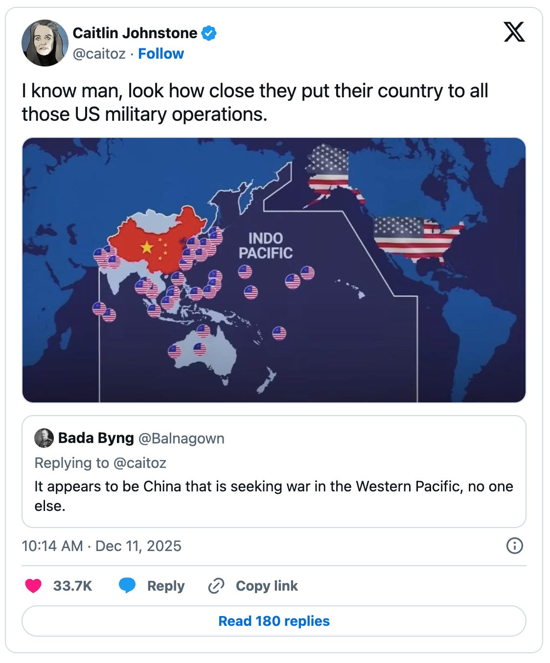 The US pirating a Cuba-bound oil tanker from Venezuela illustrates how the empire is hurrying to shore up control over Latin America in the same way the US and Israel are quickly shoring up control over the middle east. There’s a window of opportunity to shove through a bunch of pre-existing military agendas in both regions, and they’re aggressively seizing it before their attention has to turn to bigger geopolitical fish.