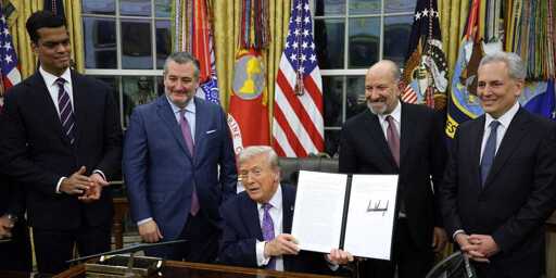 U.S. President Donald Trump displays a signed executive order as (2nd L-R) U.S. Sen. Ted Cruz (R-TX), Commerce Secretary Howard Lutnick and White House artificial intelligence (AI) and crypto czar David Sacks look on in the Oval Office of the White House on December 11, 2025 in Washington, DC. The executive order curbs states’ ability to regulate artificial intelligence, something for which the tech industry has been lobbying (Photo by Alex Wong/Getty Images).