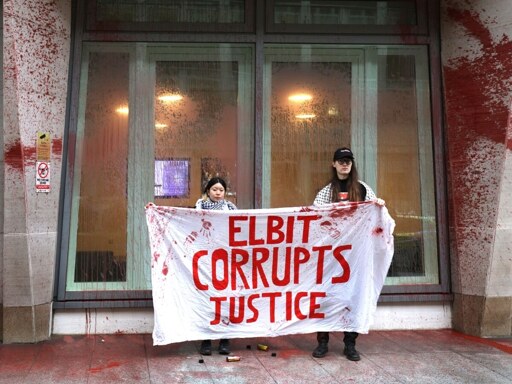 The hunger strike is approaching its seventh week, and there’s still no response from the British government. So activists from the group took action against the Ministry of Justice. At 8am, using re-purposed fire-extinguishers, they covered the front of the building in symbolic blood-red paint. The activists then locked-on in front of the building with a banner which read “Elbit corrupts Justice”.