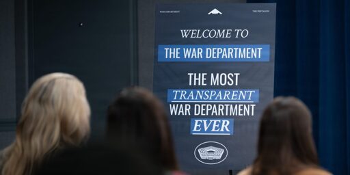 Wilson also said that “legacy media chose to self-deport from this building,” a cute way of noting that dozens of news organizations — among them the New York Times, the Washington Post, the major broadcast news outlets, and even Fox News and Newsmax — gave up their press passes rather than sign on to the administration’s blatantly anti-First Amendment set of rules for reporting on Pete Hegseth’s Department of War. Among those rules was a provision allowing journalists to be expelled for reporting on anything, whether classified or unclassified, not approved for official release.