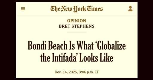 New York Times warmonger Bret Stephens penned an article titled “Bondi Beach Is What ‘Globalize the Intifada’ Looks Like,” arguing that the shooters “were taking to heart slogans like ‘resistance is justified,’ and ‘by any means necessary,’ which have become ubiquitous at anti-Israel rallies the world over.”