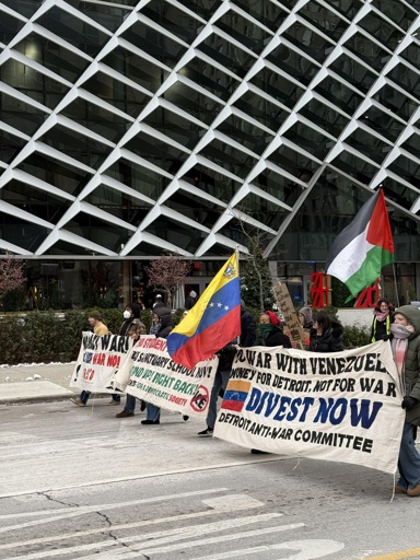 As part of the rally, Daanyal Syed of Detroit Anti-War Committee stated, “This administration is bloodthirsty and looking to both plunder Venezuela for its oil and gold and use our tax dollars to stimulate the war economy. We know this because the very same war profiteers who profit off war with Venezuela have already made and continue to make millions off the genocide of Palestinians, the horrifying conditions in Sudan, in the Philippines, and across the world wherever the U.S. intervenes.”