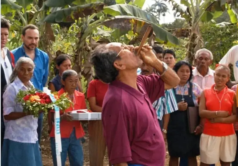 Ecuador blends indigenous, African, and Catholic customs. In Otavalo, a Kichwa community, a purification ritual involves bathing the deceased in water with rosemary and carnations. The used water is thrown far away, symbolizing eternity and new beginnings. Funeral soups are essential, and the gathering doubles as a fundraiser for the family. Family members narrate the year’s major events so the departed knows all that transpired. The Taita Maestro leads Catholic prayers in Kichwa.
