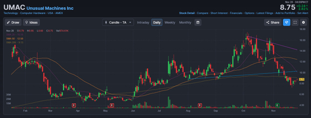This year, Unusual Machines won big contracts with the Pentagon to build drones for the Defense Department. So this is a stock that should have gone straight up, but instead is lower today than when Trump took over from Biden.