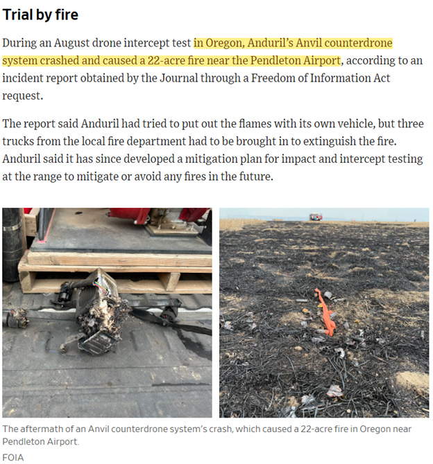 Another test in California, this time for the Fury jet. It had to be delayed by debris that caused engine damage. Up in Oregon, the company’s counterdrone system literally crashed and burned, causing a large fire there: