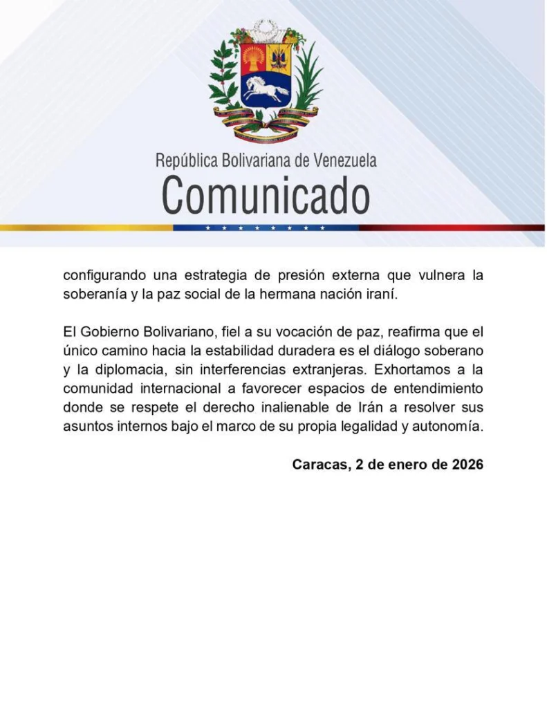 Venezuela warns against the use of digital platforms to destabilize Iran, describing these practices as a “technique typical of Fifth Generation Warfare.” Furthermore, it condemned the “Unilateral Coercive Measures” imposed by Washington, which it considers a strategy of external pressure that “violates the sovereignty and social peace of the sister nation of Iran.”