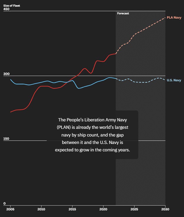 The supply chains, the shipyards, the highly skilled labor that can turn out whatever the commercial shipping industry needs are also necessary for building ships for military forces, and that red line for how many ships the Chinese Navy puts to sea is the result. It’s the biggest surface navy in the world, and still growing.