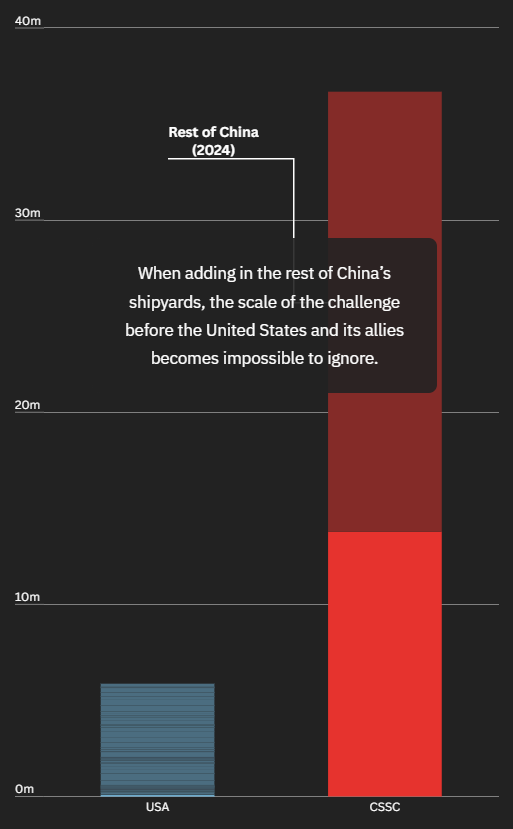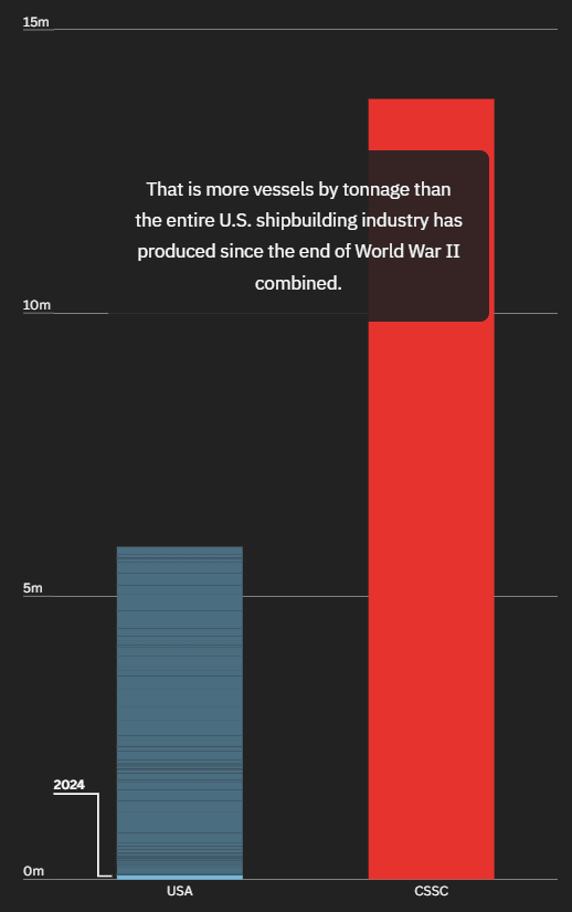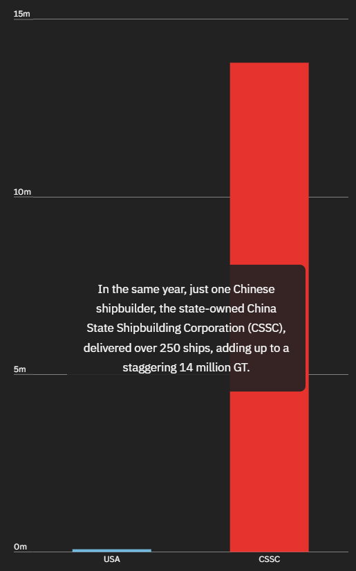 That one Chinese company, the China State Shipbuilding Corp, built more tonnage in 2024, than all the shipyards in the United States, combined, for the past 80 years.
