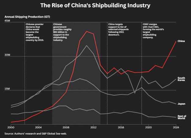 China’s “overcapacity” is an enormous advantage. All those companies, with all that capacity, competing against each other, and against all the other shipyards on earth. Quite obviously it’s a serious problem now for the Pentagon that a lot of the stuff they need to build warships for our navy is dependent on the Chinese supply chains. .