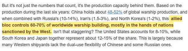 We’ll start with this amazing data point: Four countries, China plus Russia plus Iran plus North Korea— now control up to 70% of the worldwide industry for building navy ships, warships. Those four countries, under economic sanction by the West to prevent them from building weapons at all, build more military ships than the rest of the world combined.