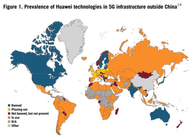 Here is the worldwide map, for the prevalence of Huawei equipment outside China. Yellow is Western Europe, and Huawei gear is in use but being phased out over time. Orange is where Huawei is in use.