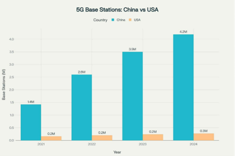 Here is where things stand today. Chinese have built over 4 million 5G base stations, compared to 270,000 for the United States. Over 15 times as many. It’s even more startling when we see how much faster: in the past three years, China added 2.7 million stations, while the US added 210,000: