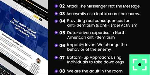 “Fight those who hate the Jewish people” is the listed purpose, and the group’s niche is “dismantle the anti-Israel network by attacking the messenger, not the message.”