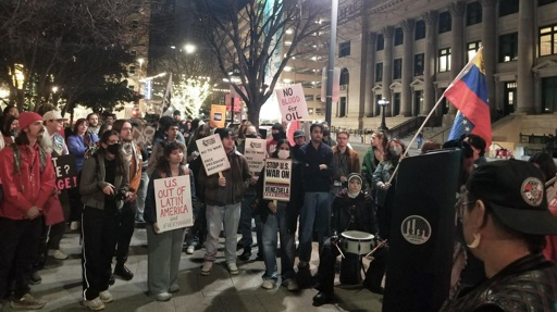During the protest, Scot Godfrey with the Freedom Road Socialist Organization remarked, “I came to the protest today because I find the imperialist actions of the U.S. disgusting and I condemn it in the strongest possible terms. It is brutally obvious that this attack on Venezuela’s sovereignty is an attempt to steal the natural resources of the Bolivarian Republic; particularly their oil. I also came because I want to make my voice heard and demand the freeing of the Maduro family and an immediate end to war mongering in the western hemisphere by the American empire.”