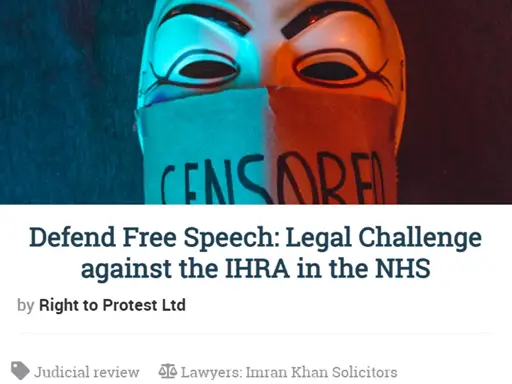 The ‘Right to Protest’ (RtP) group has instructed lawyers to begin judicial review proceedings against NHS England for adopting the unfit International Holocaust Remembrance Alliance (IHRA) ‘working definition’ of antisemitism that suppresses freedom of speech on Israel.