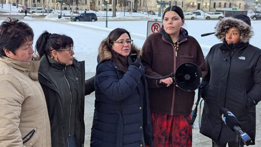 Shirley Robinson, Paige Paupanekis, Leah Gazan and Kyra Wilson at the Manitoba Legislature on Jan. 8. Photo by Crystal Greene