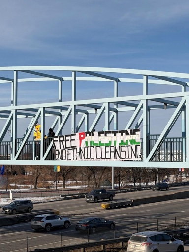 Attendees waved Palestine and Venezuelan flags in the busy intersection of Hennepin Avenue and Oak Grove on the corner of Loring Park and displayed a banner on the pedestrian bridge over I-94 reading “Free Palestine: End ethnic cleansing.”