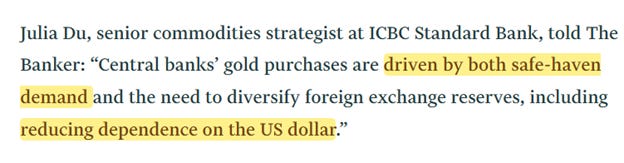 But today almost all the world’s central banks are aggressively building out their own gold reserves. Gold is a “safe haven” asset, and cannot be inflated away, but more importantly cannot be frozen or seized if held on deposit outside SWIFT systems.