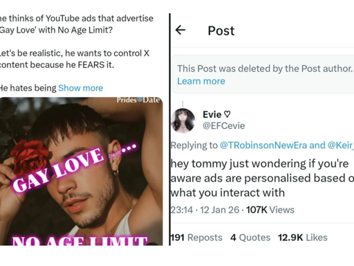 Far-right agitator ‘Tommy Robinson’ has embarrassingly deleted an X post attacking Keir Starmer for potential plans to restrict the social media platform. Robinson took a screenshot of a YouTube ad offering “GAY LOVE…NO AGE LIMIT” and used it to claim that Starmer: