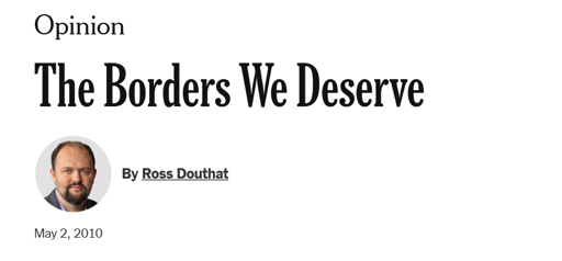 In 2010 (5/3/10), I responded to a Ross Douthat column (5/3/10) calling for the federal government to “do its job” by “regain[ing] control of its southern border.” He mocked those who criticized such efforts as requiring “a ‘Nazi’ or ‘near-fascist’ law, a ‘police state’ intervention, an imitation of ‘apartheid,’ a ‘Juan Crow’ regime that only a bigot could possibly support.” I wrote: