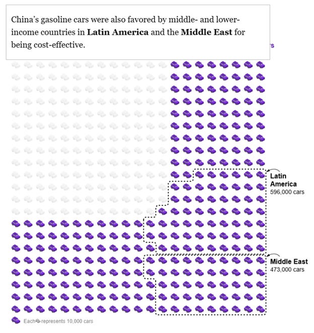 These data are from 2023, and each little car there represents 10,000 vehicles built in China, put on a ship, and sent abroad. Three years ago China exported 1.7 million electric vehicles, 50 percent more than Germany, at #2, and Europe was the most popular market for the EV’s. But 2.7 million internal combustion vehicles were built in China and exported, with huge volumes going to Russia, Latin America and the Middle East: