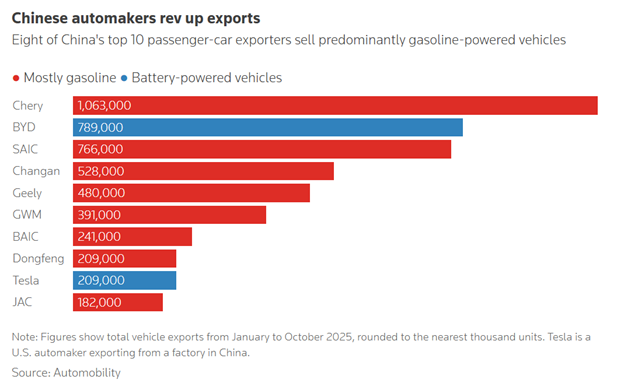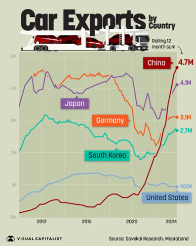 But China is rapidly taking over markets of fuel-burning cars. In 2024, China exported an estimated 6.5 million gasoline-powered models. Insiders forecast growth of an additional 4 million exports by 2030.