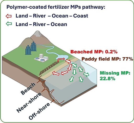 Researchers from Tokyo Metropolitan University have studied how polymer-coated fertilizer (PCF) applied to fields ends up on beaches and in the sea. They studied PCF deposits on beaches around Japan, finding that only 0.2% of used PCFs are washed into rivers and returned to the coastline. When there are canals connecting fields to the sea, this rises to 28%.