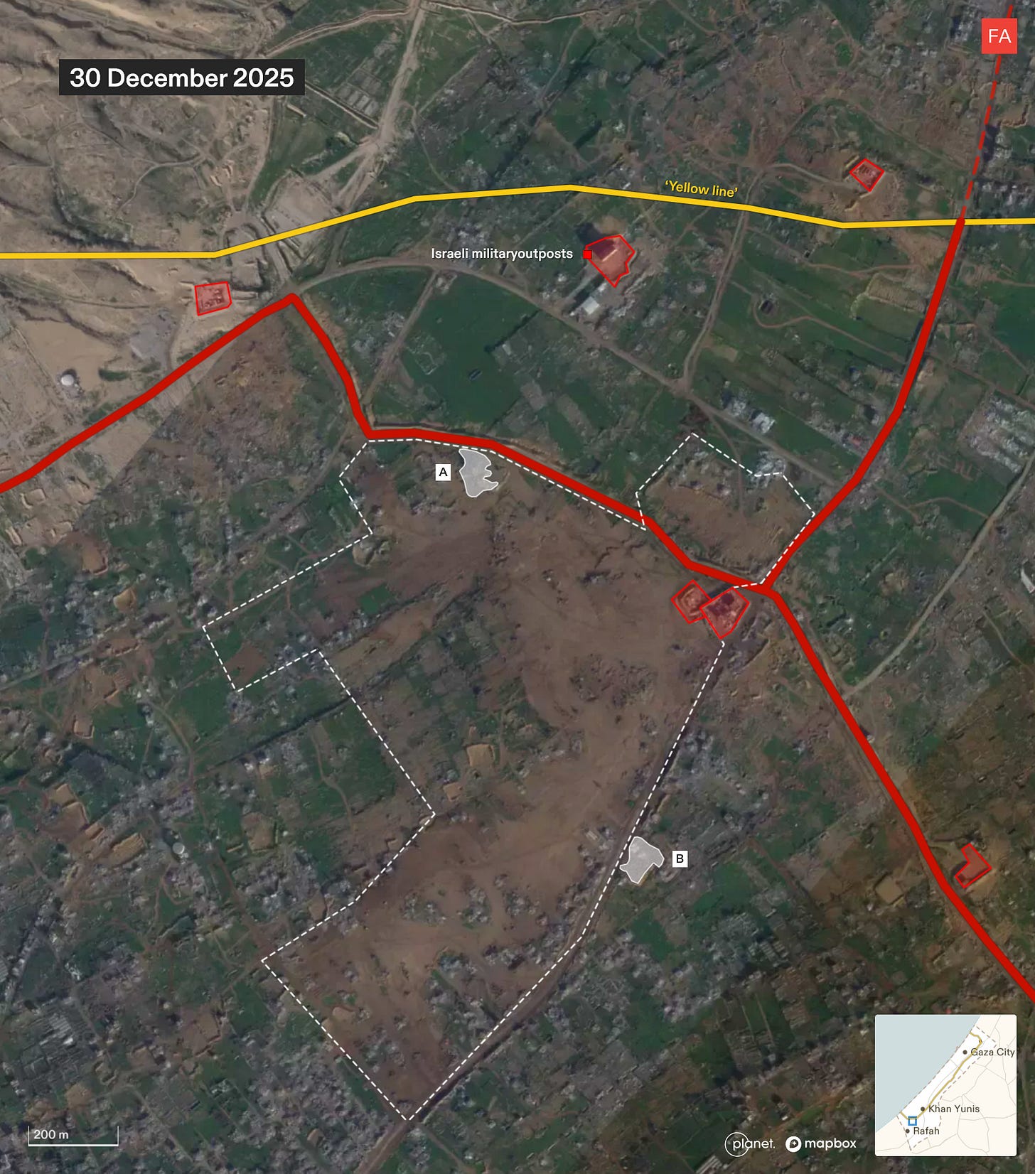 Zooming out on the satellite image from 30 December 2025, you can see that, while destruction and clearing are ongoing across Rafah, this pattern of groundwork — razing the land, compacting the ground, and clearing the rubble — is so far contained to this 1 kilometer squared.