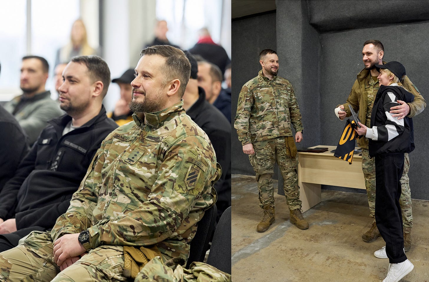 Budanov and Biletsky, who seemed unusually happy at the grand opening of the UGV school. On the right, Shipovich hugs Pavlov and meets Biletsky.