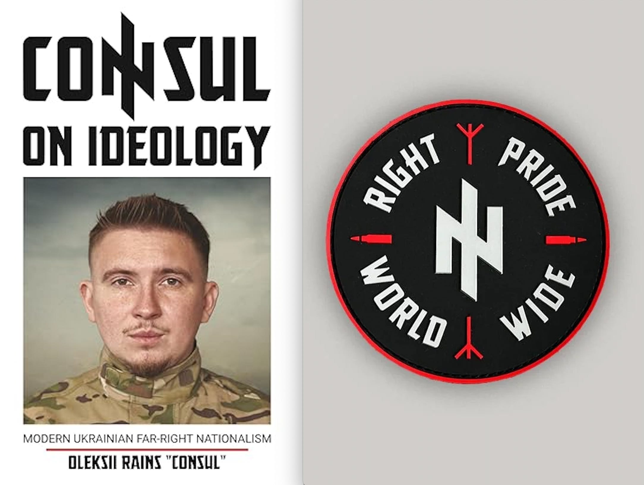 A recent book by Rains on “Modern Ukrainian Far-Right Nationalism,” and one of the patches sold on his website, which refers to the neo-Nazi slogan “White Pride World Wide.”