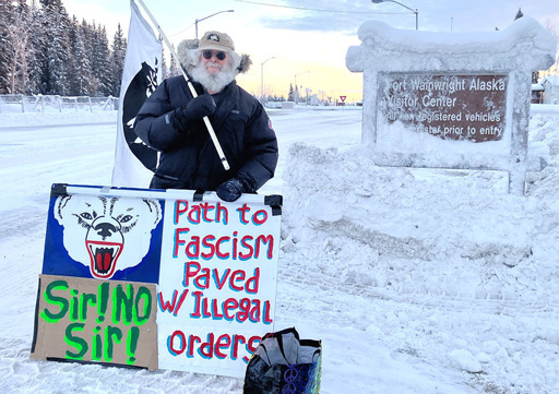 Rob is a 73 year-old Air Force veteran, longtime Alaska and former coal miner. His flyers include the G.I. Rights Hotline number to reach counselors prepared to advise troops who are questioning orders to support Israel’s genocide in Gaza or arrest U.S. citizens domestically.
