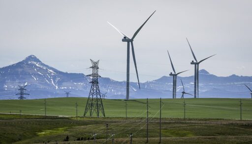 Wind turbines and power transmission lines are seen near Pincher Creek, Alta., with mountains in the background.