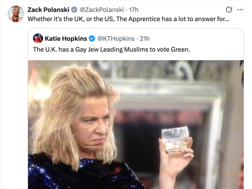 UK fascists are trying to paint the upcoming Manchester by-election as a battle between Reform and Muslims, via Zack Polanski’s Green Party. But far-right hate-monger and bigot Katie Hopkins has gone even further, sending out a dog whistle to anyone who hates Jewish and gay people too.