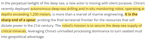 These developments should not be thought of “merely as breakthroughs in oceanography” and maritime engineering. They are “masterstrokes of geopolitics.” “The sharp end of the spear”. The technical achievements are impressive, but the objective of these technologies and research is to locate and scoop up cobalt, nickel, and rare earth elements.