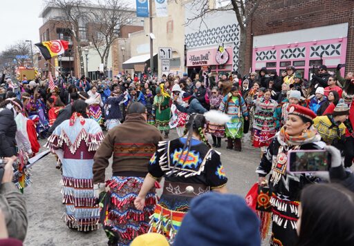 Women dance before the site of Alex Pretti’s killing in Minneapolis on Sunday, Feb. 1, 2026. Native activists held a ceremony to honor the lives of Renée Good and Pretti, who were killed by federal agents. (Kevin Abourezk / ICT)