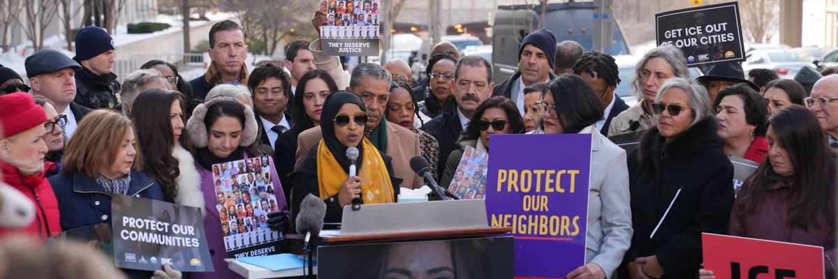 “The American people are begging us to stop sending their tax dollars to execute people in the streets, abduct 5-year-olds, and separate families,” said Rep. Rashida Tlaib (D-Mich.), who gathered with other progressive lawmakers in the cold outside DHS headquarters on Tuesday. “ICE was built on violence and is terrorizing neighborhoods. It will not change… No one should vote to send another cent to DHS.”
