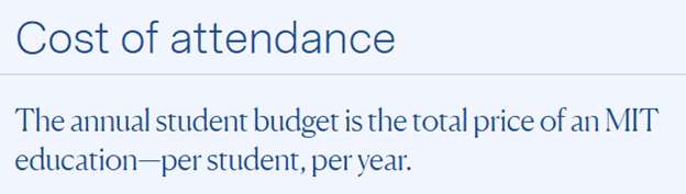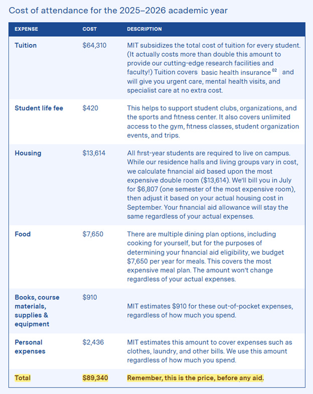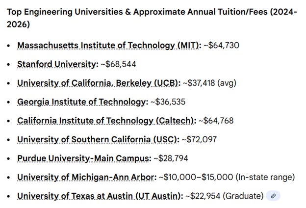 Tuition of $64 thousand, housing and food is another twenty thousand, total of over $89,000. Financial aid is available, they are happy to point out. MIT is the top US university for engineering, and American students may be getting what they pay for. Tuition there is not too far out of line with other top engineering schools in the United States, who are ranked lower: