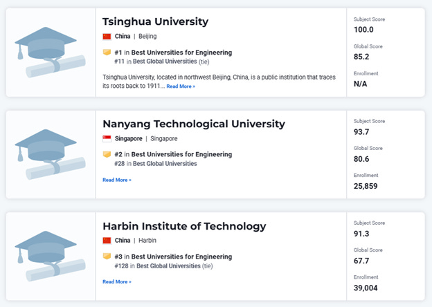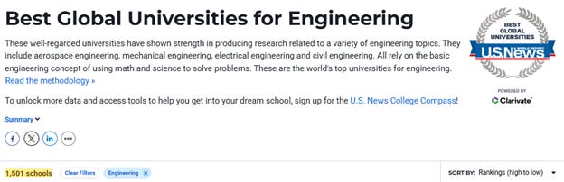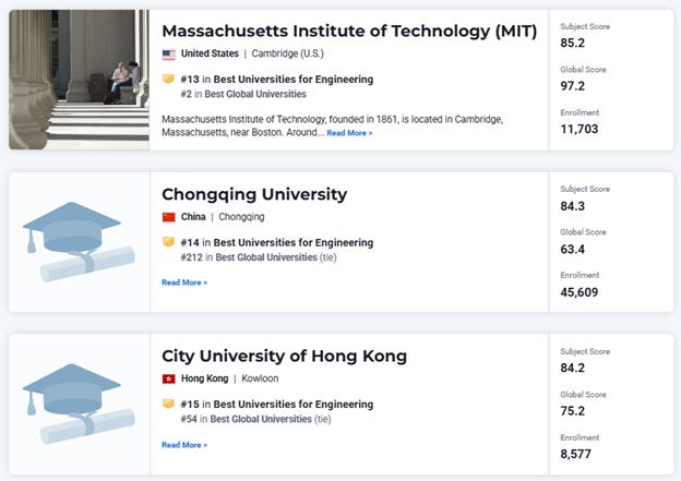 I admit that I am cherry-picking the data here. If your kid wants to be a lawyer or study political science or French Literature, this isn’t for you. Here is the US News and World Report, and their rankings of top global universities for Engineering: