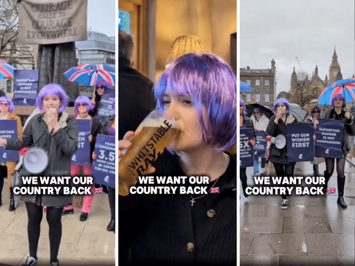 Jess, who claims to be British but hates everything about British food, has become a polarising figure at demonstrations. I mean, surely if you’re going to attend a demo to ‘protect our women’ with the racist*Pink Ladies,* you wouldn’t be happy to share a space with ex-Reform MP and known wife beater James McMurdoch?