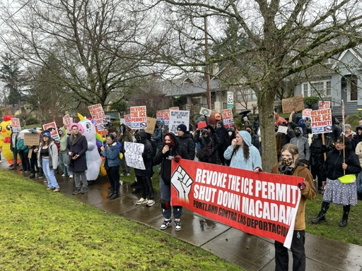 Portland, OR – Over 100 protesters rallied in front of Portland Mayor Keith Wilson’s home on Saturday February 7, to demand he take immediate action to shut down the Portland ICE Facility. The protest was called by the immigrant rights organization, Portland Contra Las Deportaciones (PDXCD).