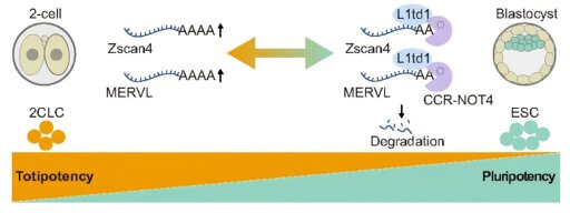 A new study has found that L1td1, a protein evolutionarily co-opted from the Long interspersed nuclear element 1 (LINE1) retrotransposon, functions as a critical “gatekeeper” restricting pluripotent stem cells (PSCs) from reverting to a totipotent state. The research demonstrates that loss of L1td1 triggers the reactivation of totipotency-associated genes and endogenous retroviruses (ERVs), prompting cells to spontaneously regress to a totipotent-like (or 2-cell-like) state that mirrors the earliest stages of embryogenesis. Notably, the study identifies L1td1 as a key post-transcriptional regulator that suppresses endogenous viral elements to sustain pluripotency.