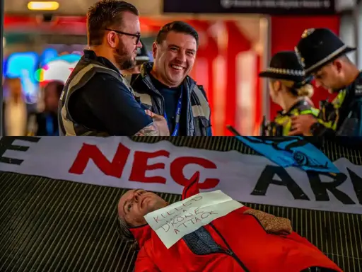 Of course, local activists were intent on shining a light on proceedings. The arms fair has moved from Telford due to protests – but where the arms go, the people follow. And, based on how hard it was to even find, the NEC was clearly aware of the PR implications.