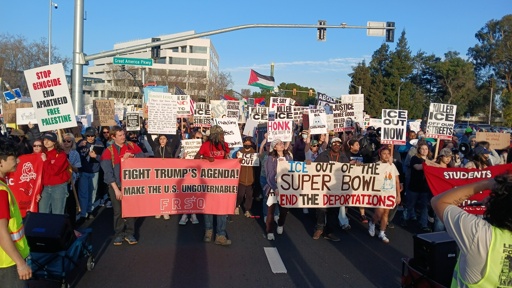 San Jose, CA – Over 1000 protesters marched and rallied during the Super Bowl LX, February 8, to demand Immigrations and Customs Enforcement (ICE) out of San José. Activists, community organizations and unions rallied against the Department of Homeland Security’s (DHS) threat to conduct immigration enforcement during the Super Bowl LX.