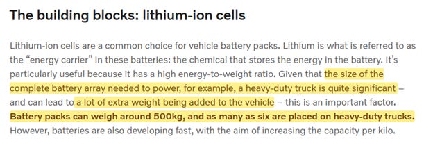 Mass adoption is held back, however, by the battery problem: the batteries in large trucks are very large and heavy, and the current generation of battery has a limited range, compared to cars.