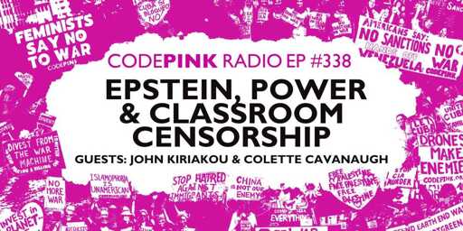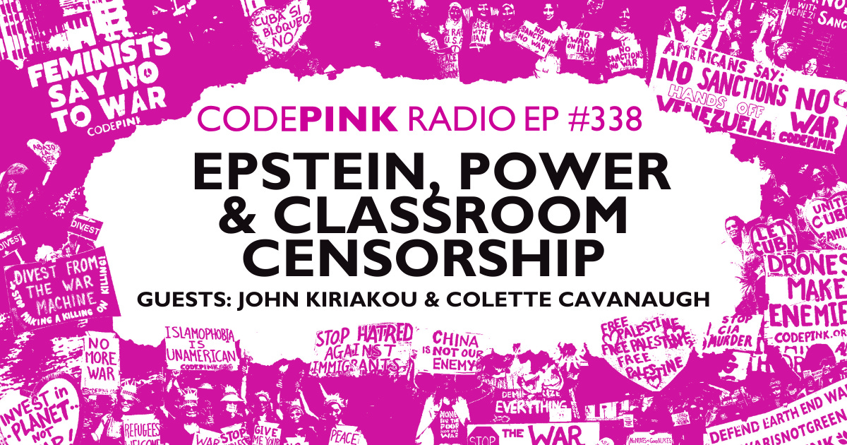 Episode 338 of CODEPINK Radio: Epstein, Power & Classroom Censorship: This week on CODEPINK Radio, Marcy Winograd brings you a new episode featuring our first segment, Empire on the Rocks, with former CIA analyst John Kiriakou discussing the largely ignored story of Jeffrey Epstein and the geopolitical questions surrounding his network, followed by a conversation with Colette Cavanaugh of the American Arab Anti-Discrimination Committee on how educators and advocates are navigating the teaching of Palestine in U.S. public schools and defending the right to tell the truth about history and current events.