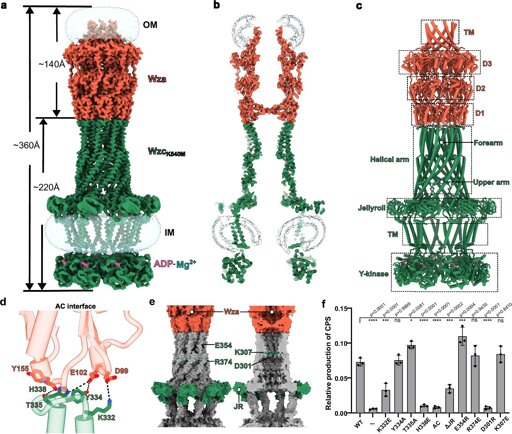 Most bacteria, including many bacterial pathogens, are surrounded by an outer protective layer of sugar molecules, known as a capsule. This primarily protects the bacteria from environmental influences, but also serves as a kind of cloak of invisibility, enabling them to evade the phagocytes of our immune system. Structural biologists at the Helmholtz Center for Infection Research (HZI) have now used cryo-electron microscopy to visualize the central Wza-Wzc protein complex, with which sugar molecules pass from the interior of the bacterial cell to the outside, in three dimensions at the atomic level for the first time.