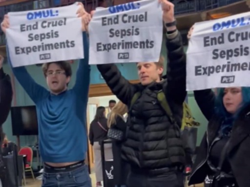 Attendees at the Queen Mary University of London (QMUL) Postgraduate Open Day Event had a more memorable experience than expected on 18 February. A group of PETA supporters stormed the famous Octagon inside the Queens’ Building bearing signs that read, “QMUL: End Cruel Sepsis Experiments,” and chanting, “Sepsis experiments should be cruelty free.”
