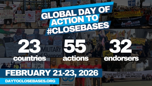 On February 21-23, 2026, individuals and organizations around the world took coordinated action in their communities to call for the closure of all military bases as part of the Global Days of Action to Close Bases. Details about plans for the day, participants, motivations, and goals are at DayToCloseBases.org.
